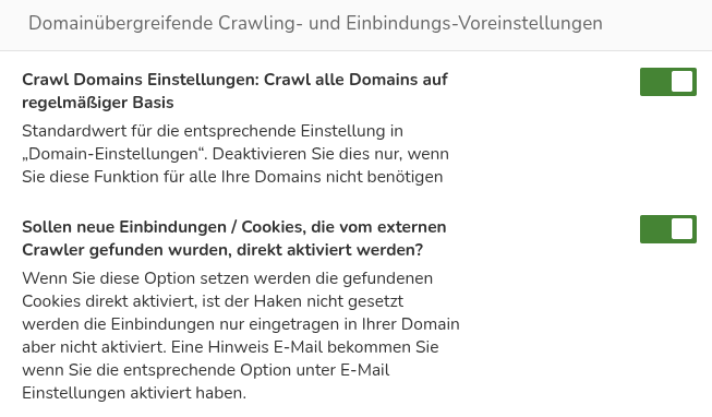 Unter dem Menüpunkt Verfügbare Einstellungen (zu finden links im Menü oder durch einen Klick auf den Benutzernamen oben rechts) ist es auch möglich, domain-übergreifend folgende Einstellungen für den Cookie-Crawler zu tätigen: