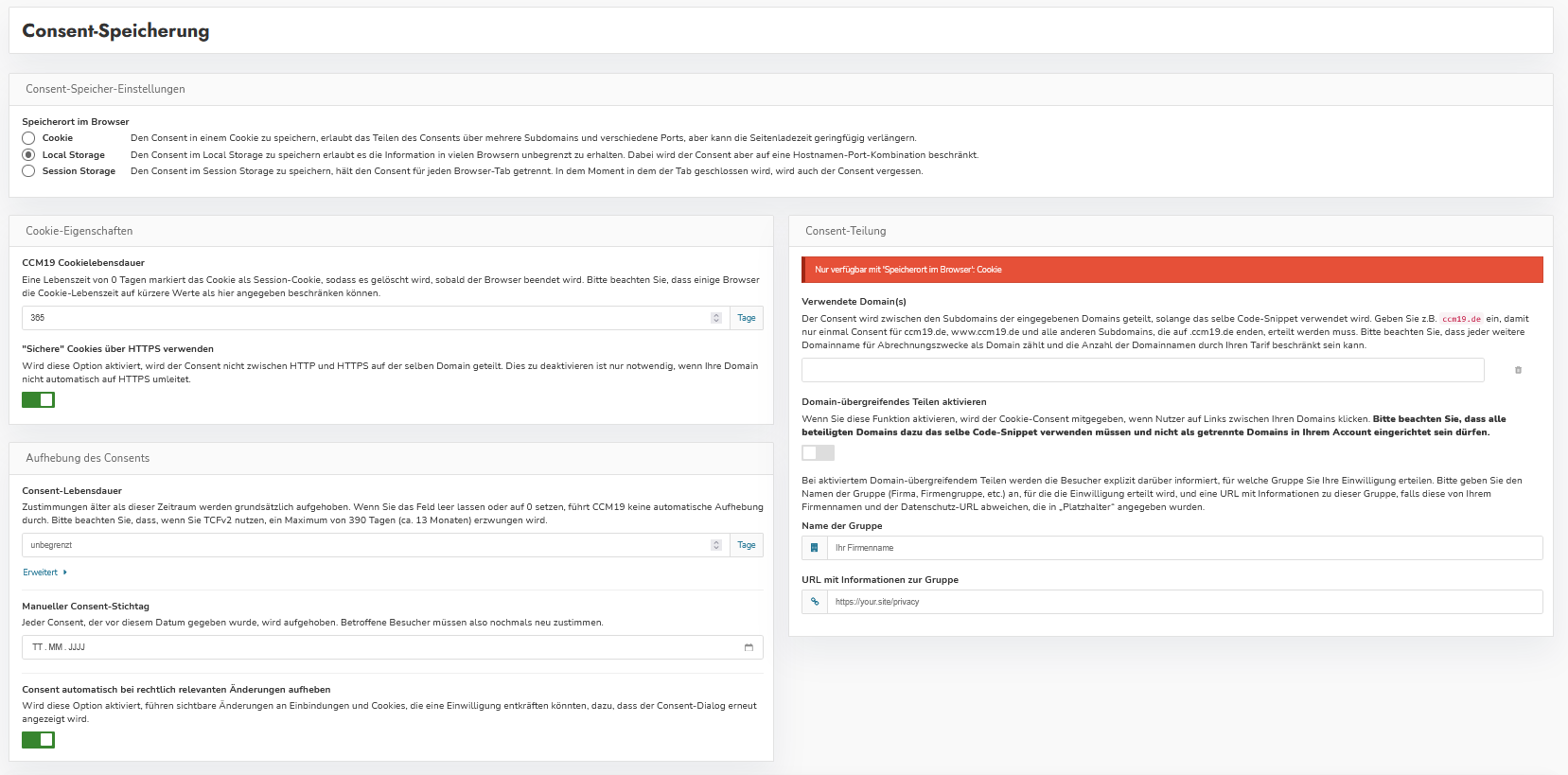 CCM19 kann die Daten für den Consent sowohl in einem Cookie, im Local Storage als auch im Session Storage speichern. Die einzelnen Methoden haben Vor- und Nachteile.