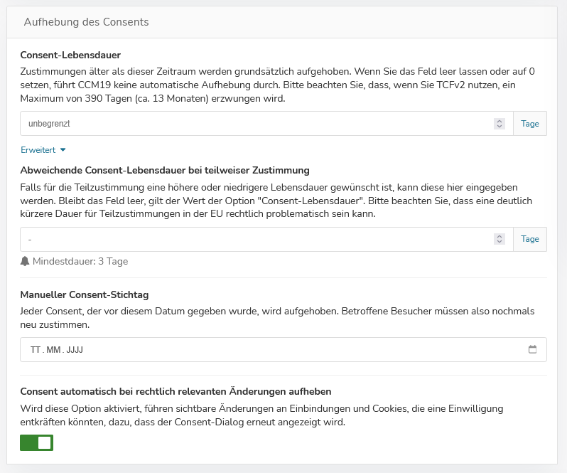 Zustimmungen älter als dieser Zeitraum werden grundsätzlich aufgehoben. Wenn Sie das Feld leer lassen oder auf "0" setzen, führt CCM19 keine automatische Aufhebung durch. Bitte beachten Sie, dass, wenn Sie TCFv2 nutzen, ein Maximum von 390 Tagen (ca. 13 Monaten) erzwungen wird.