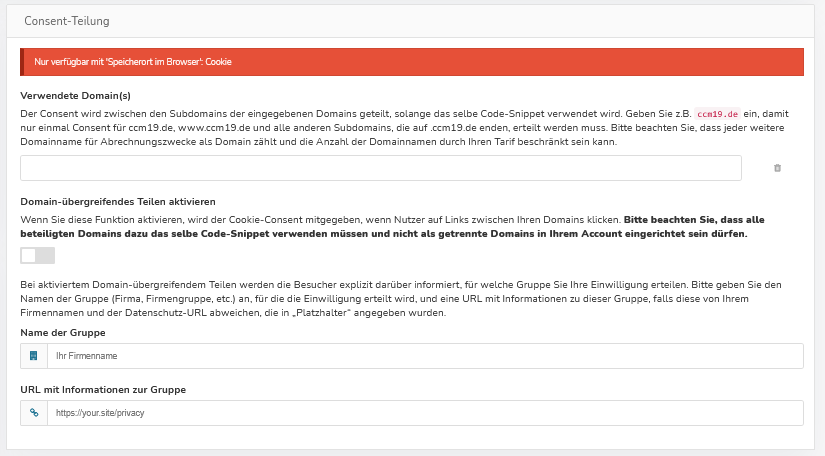 Mit CCM19 ist es möglich, den Consent unabhängig von Third-Party-Cookies über beliebig viele Domains und Subdomains hinweg zu teilen. Tragen Sie dazu die Domains, mit denen der Consent geteilt werden soll, in das Feld ein.
