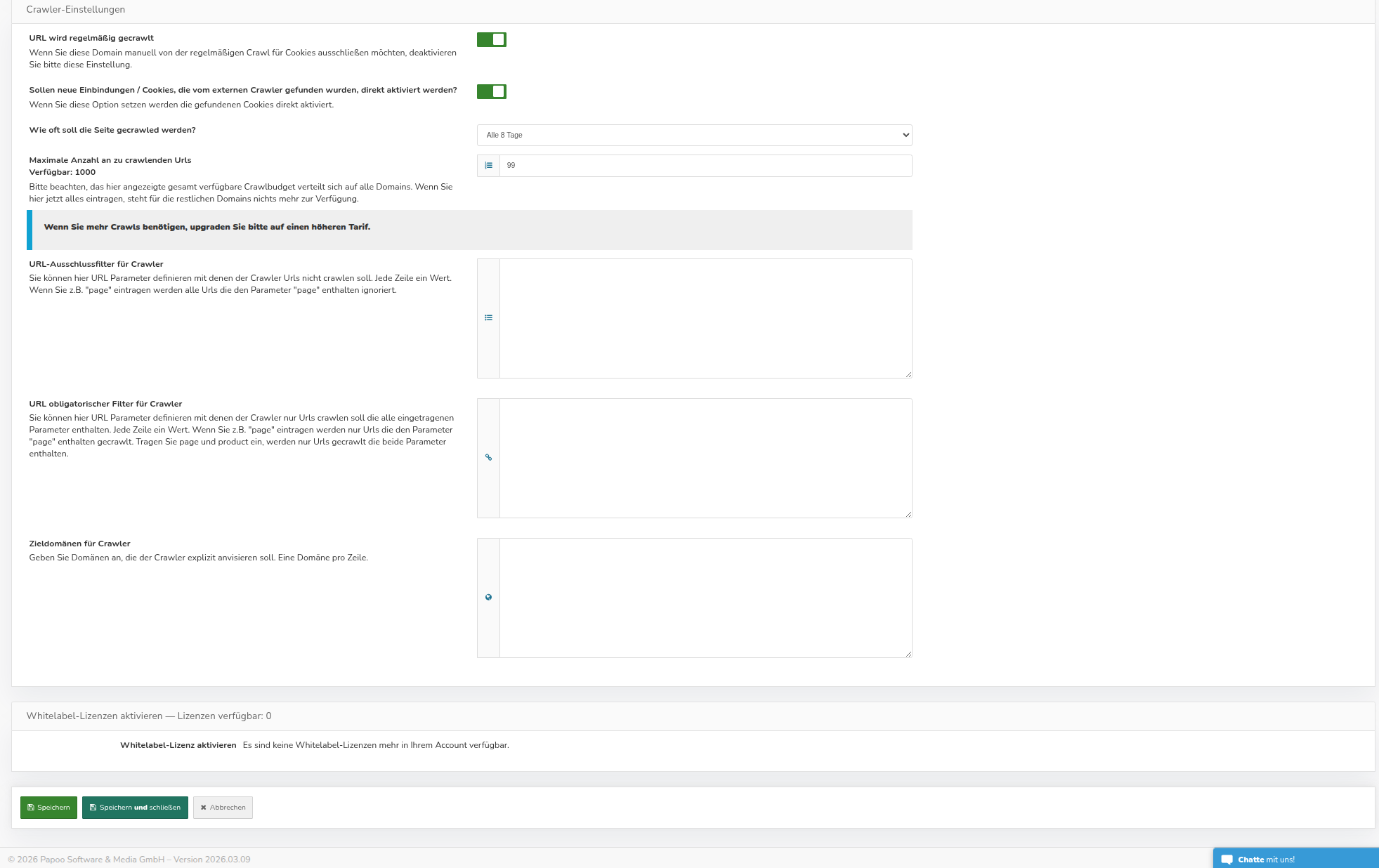- Maximale Anzahl an zu crawlenden URLs: Legt fest, wie viele URLs der Crawler maximal für dieses Projekt prüfen soll. Beachten Sie, dass das hier angezeigte verfügbare Crawlbudget sich auf alle Domains verteilt. Wenn Sie hier alles eintragen, steht für die restlichen Domains nichts mehr zur Verfügung.