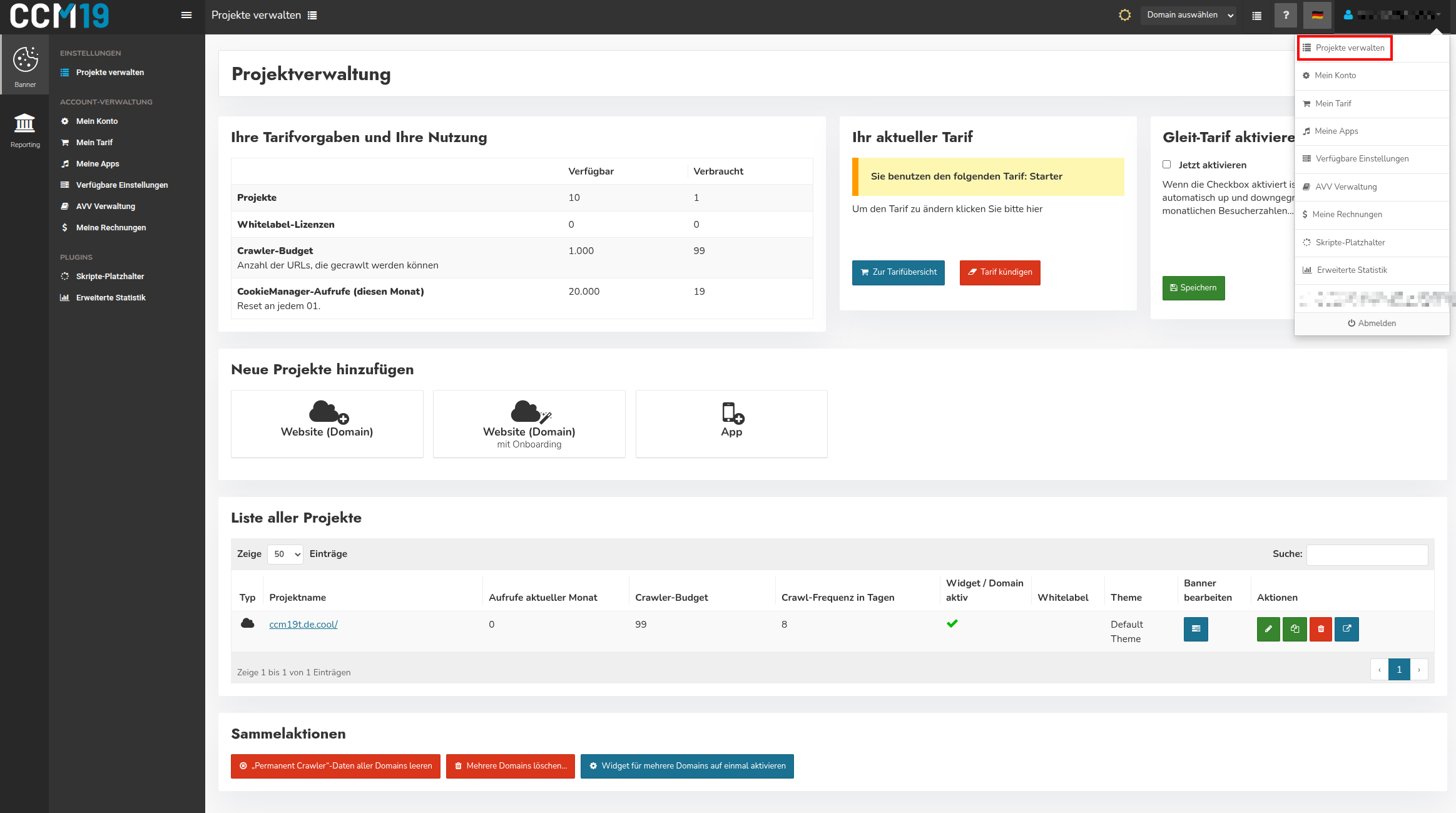 Die Projektverwaltung ist die Startseite nach dem Log-in. Sie erreichen sie außerdem jederzeit, indem Sie oben rechts auf Ihren Benutzernamen klicken und dann auf den Punkt "Projektverwaltung"