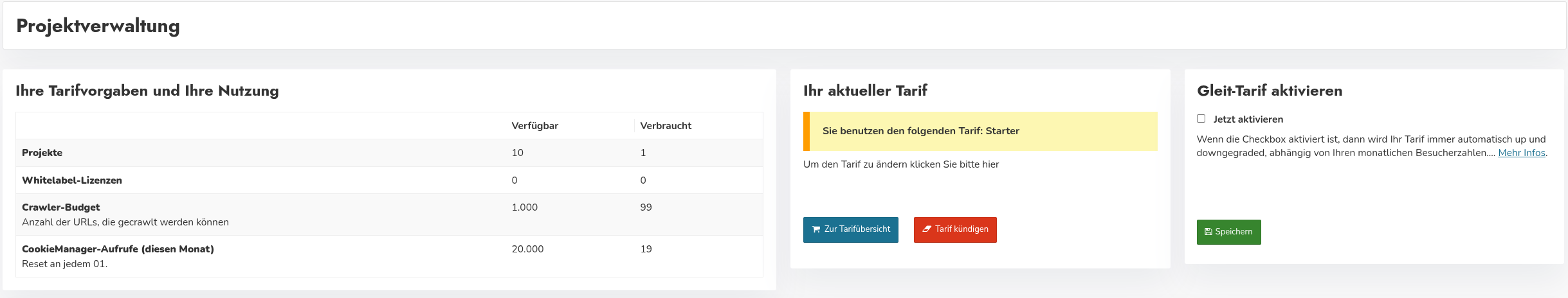 Die Aktivierung finden Sie in der Projektverwaltung im rechten Kasten "Gleit-Tarif aktivieren". Setzen Sie den Haken bei "Jetzt aktivieren" und klicken Sie auf "Speichern".
