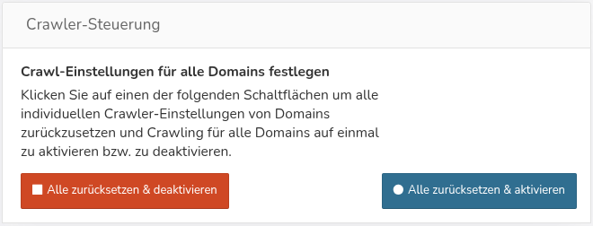 Wird hier das Crawling selbst oder das automatische Aktivieren von neuen Funden deaktiviert, gilt das für alle Projekte in dem Account. Zudem gibt es die Möglichkeit, alle Einstellungen zurückzusetzen und den Crawler für alle Domains zu (de)aktivieren: