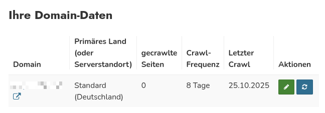 Die Crawler-Einstellungen können pro Domain separat festgelegt werden. Um zu diesen Domain-Einstellungen zu gelangen, muss über die Projektverwaltungsebene die entsprechende Domain bearbeiten werden (via Klick auf das Symbol mit dem grünen Stift). Alternativ können die Domain-Einstellungen auch direkt über das Domain-Dashboard aufgerufen werden. Hier wird auch angezeigt, wann der letzte Crawl war und wie viele Seiten gecrawlt wurden. Mit einem Klick auf den blauen Button kann der Cookie-Scanner auch manuell gestartet werden. Bitte beachten Sie, dass der Scan nach einem Klick nicht unmittelbar durchgeführt wird, da hier nach einem Warteschlangen-System vorgegangen wird.